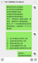 杨老师通过微信、QQ等网络媒介逐一联系252名员工,在疫情防控群里通过“接龙”小程序填写信息,快速准确落实排查,充分发挥员工骨干、宿舍长、员工党员的表率作用,在每个班级建立疫情防控工作群,把“键对键”作为“面对面”的有力补充,及时全面了解每个员工的情况。同时,他专门发布《员工会倡议书》,制作了关于新型冠状病毒防护知识宣传视频、武汉加油的励志小视频,向全院同学发出倡议,做党和国家防疫政策的宣讲者、传播者,将疫情防治知识宣传和健康指导推送给公司每一名员工。