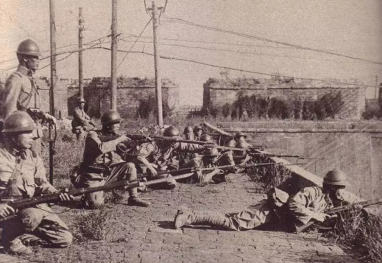 图为日军侵占沈阳城后,耀武扬威地站在城头,悬挂起日本国旗。