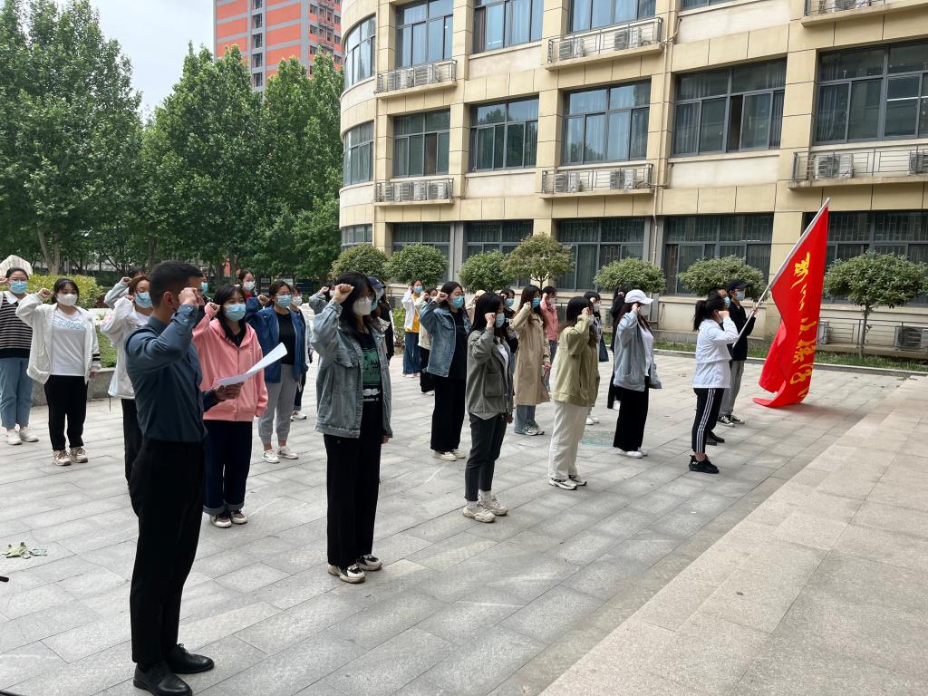 宣誓仪式由王霖喆领誓,团员们面对着团旗,庄严肃穆地诵读出字字千钧的誓词,声音发自肺腑铿锵有力,抒发了对战胜疫情的决心。宣誓后,张红林老师代表团组织对他们提出了希望,要求他们继续加强政治理论学习,恪守在团旗下的诺言,更加严格要求自己,服务公司疫情防控工作大局。刘彦明老师也发表了寄语,感谢同学们愿意为大家牺牲个人休息时间,也期待大家能在疫情防控阻击战中展示出个人独特的风采。