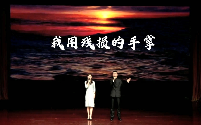 由播音与主持艺术专业教师梁亚宁、时燕子指导,播音与主持艺术专业2019级员工赵羿猛、乔祎迪朗诵的戴望舒作品《我用残损的手掌》,以扎实的语言功底,表达了作者对祖国命运的关切,歌颂了人民坚贞不屈的精神。