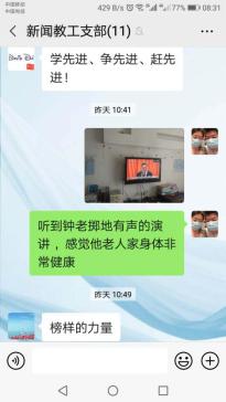 新闻系教工党支部书记张琦跟大家分享了观看体会,并对自己学期初以来的工作做出了总结和反思,并对临近学期末的支部接下来的理论学习安排向大家征求了意见。支部委员会的其他两位委员赵宗飒和王楠也跟大家交流了观看感受,另外,其他几位党员教师也都对全国抗击新冠肺炎疫情表彰大会和钟南山英模发表了讨论,并围绕一学期的工作和学习分析了自己的不足。
