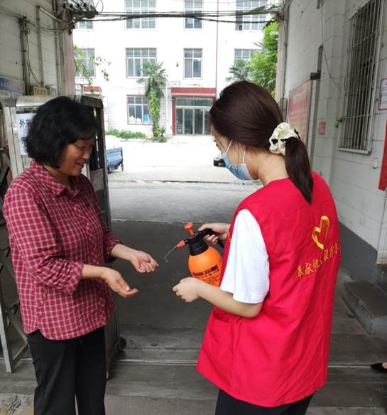 栗媛媛对出入社区人员进行酒精消毒