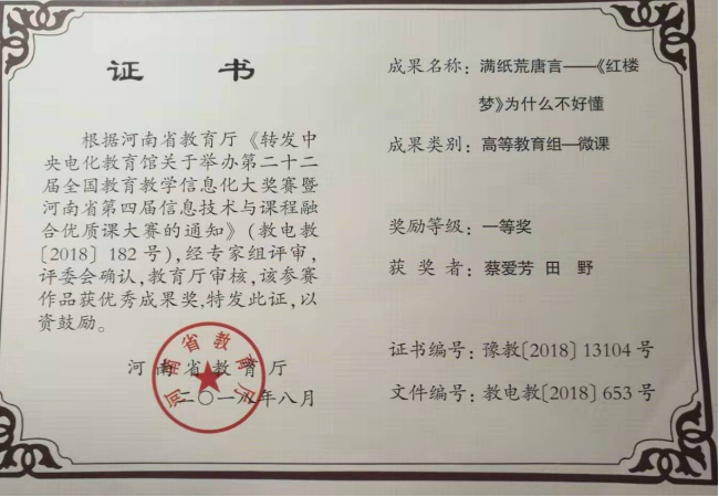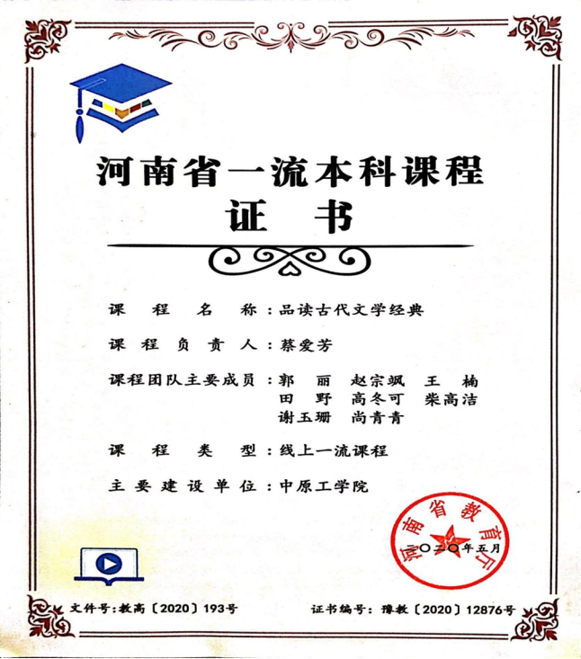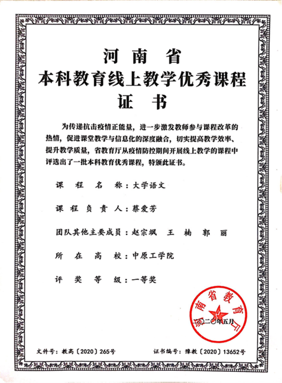 8.省级教学成果奖(“大学语文”获河南省本科教育线上教学优秀课程一等奖)